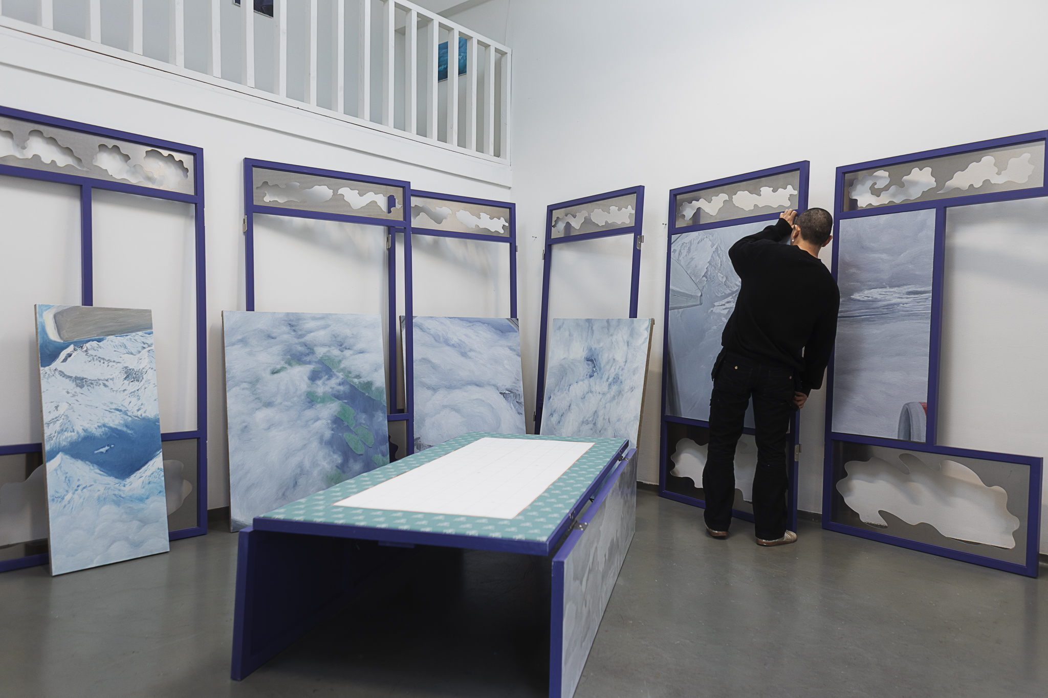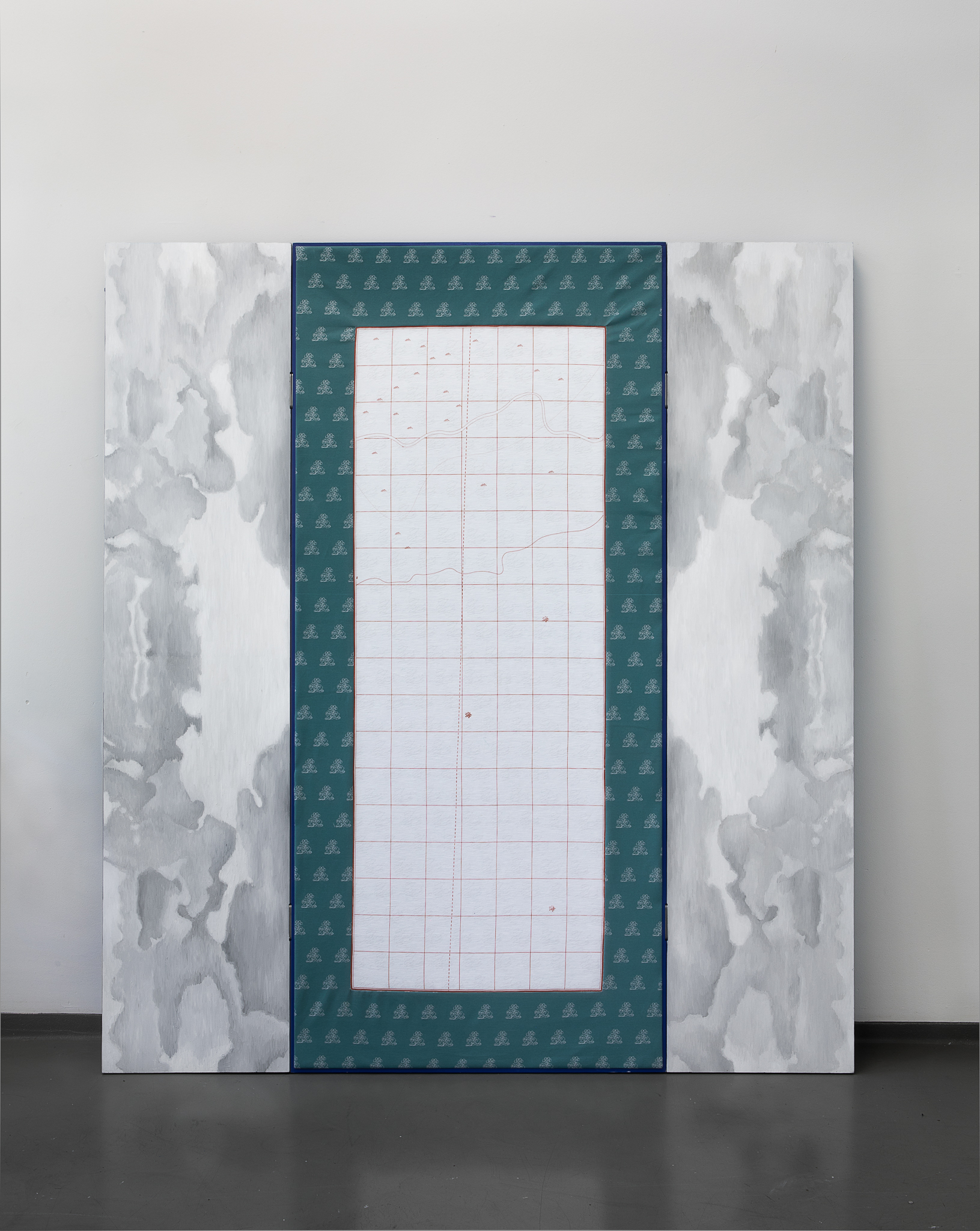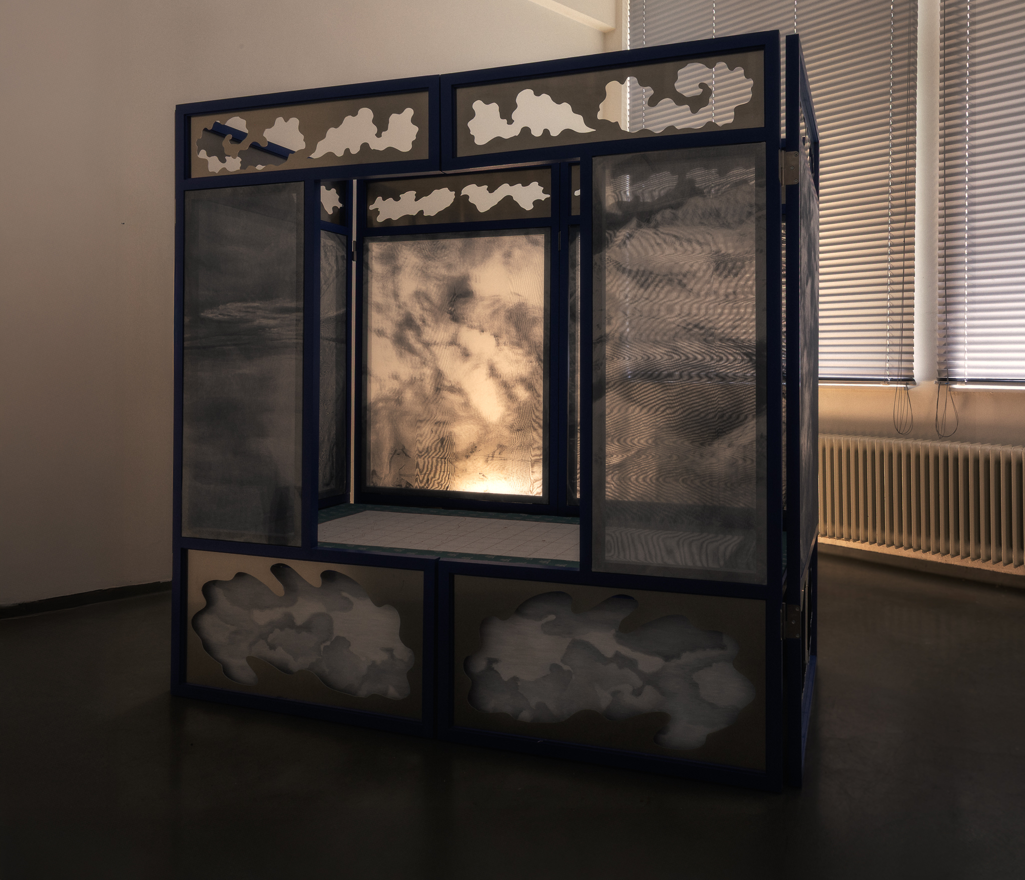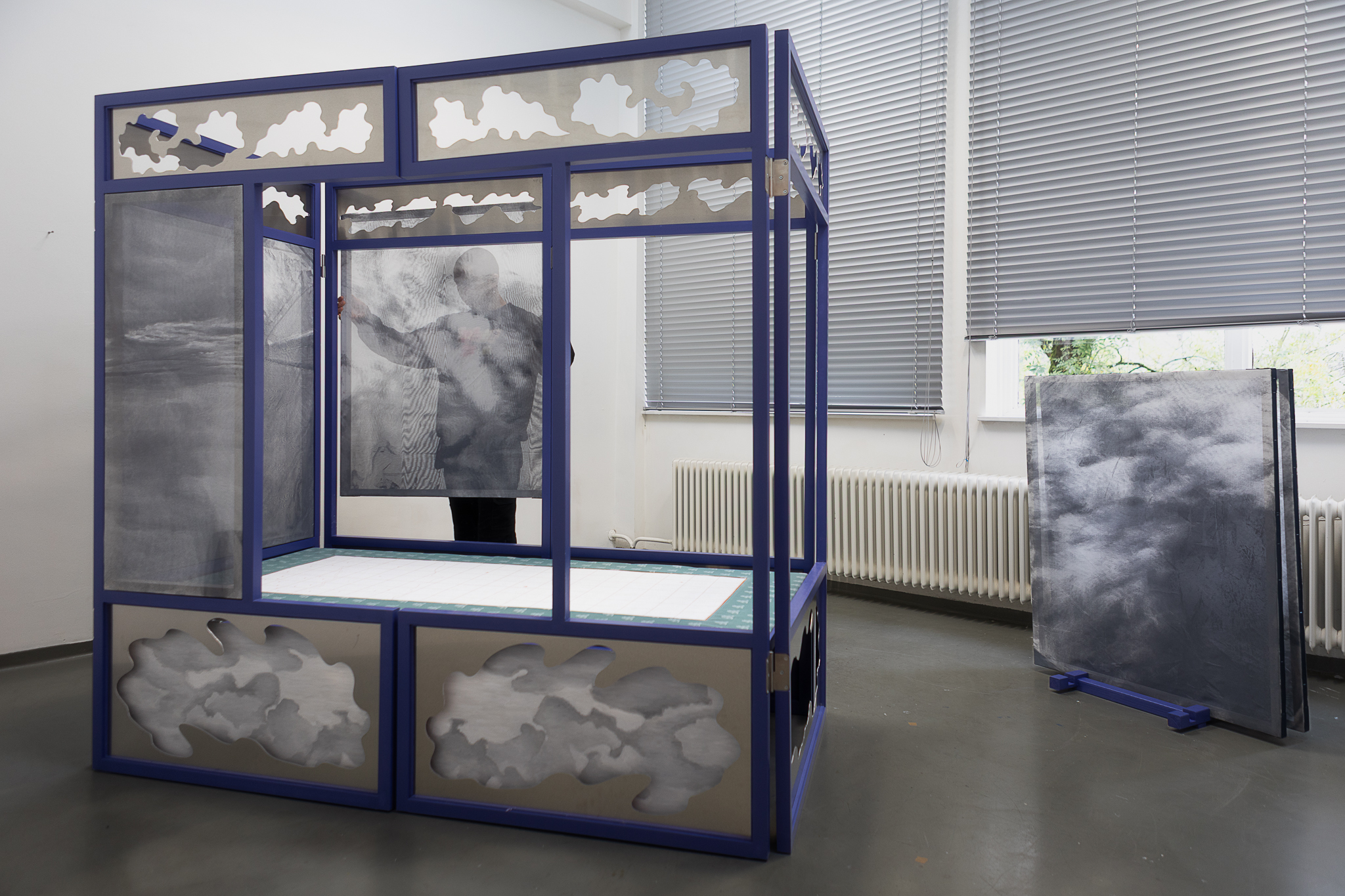 Clouds gathered from past journeys drift across the surfaces—fragments of memory, still yet restless. Traveling While Lying Down (卧游) recalls bed-screens in Imperial China whose painted panels turned rest into imaginative travel. The work moves between two lineages of landscape painting: one a scenic, museological hang, with fragments stilled and flattened for viewing, the other a daily, quiet act of repair, a momentary folding of the landscape into a functioning bed. An invitation to dwelling and participation, depending on when one arrives, the other half is always elsewhere. You catch one state and imagine the other. The exhibition is part of Open Studios 2025 at Jan van Eyck Academie.