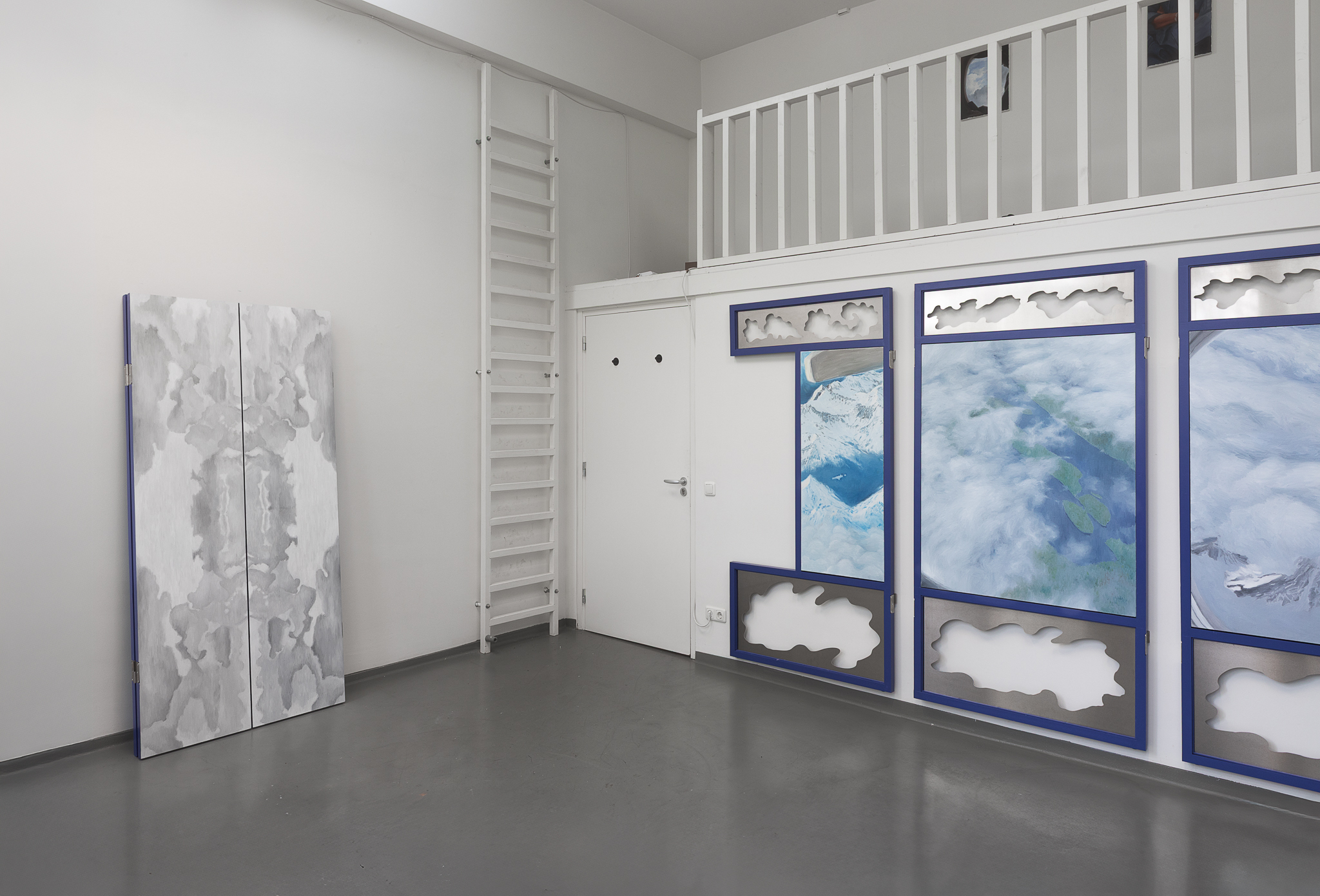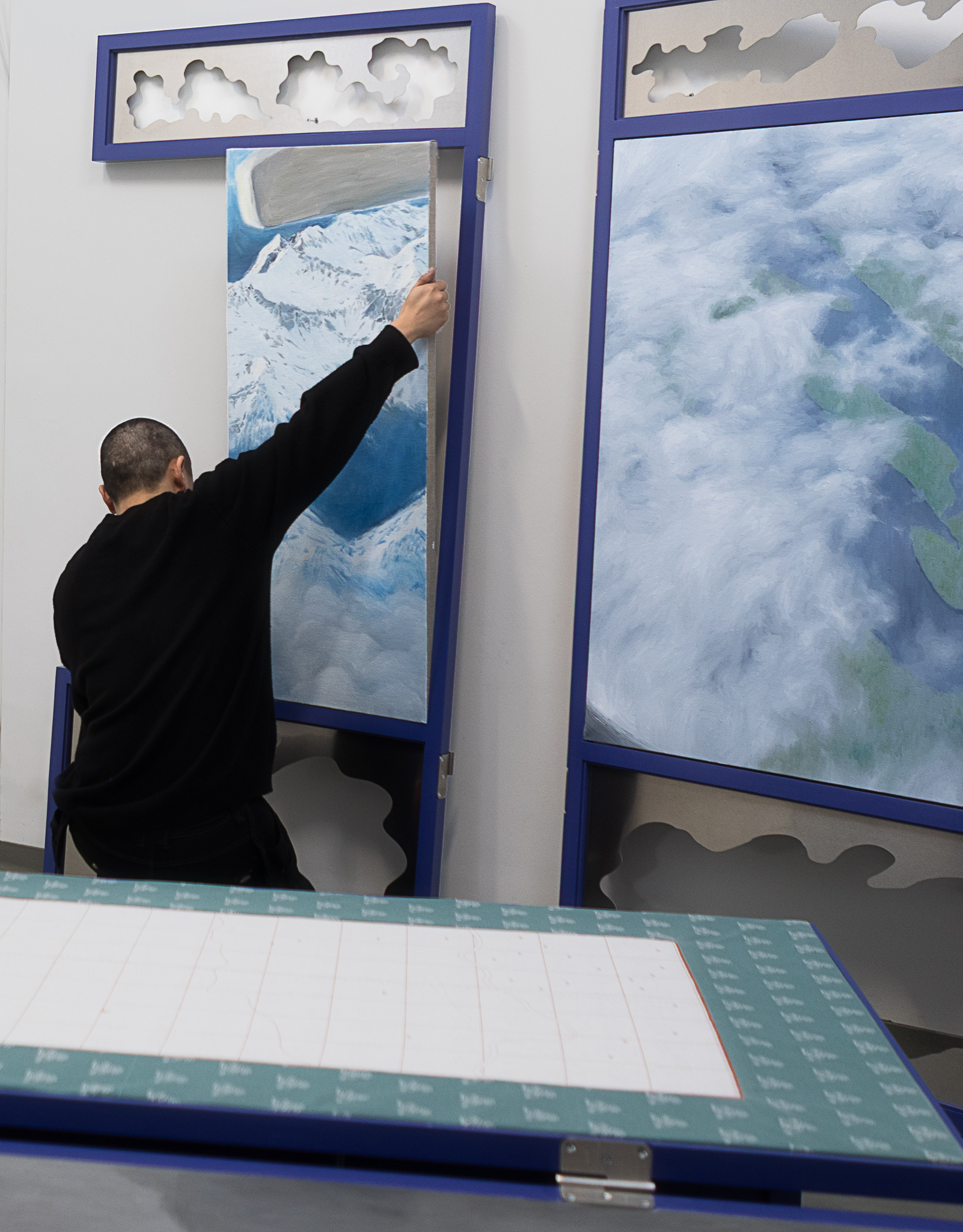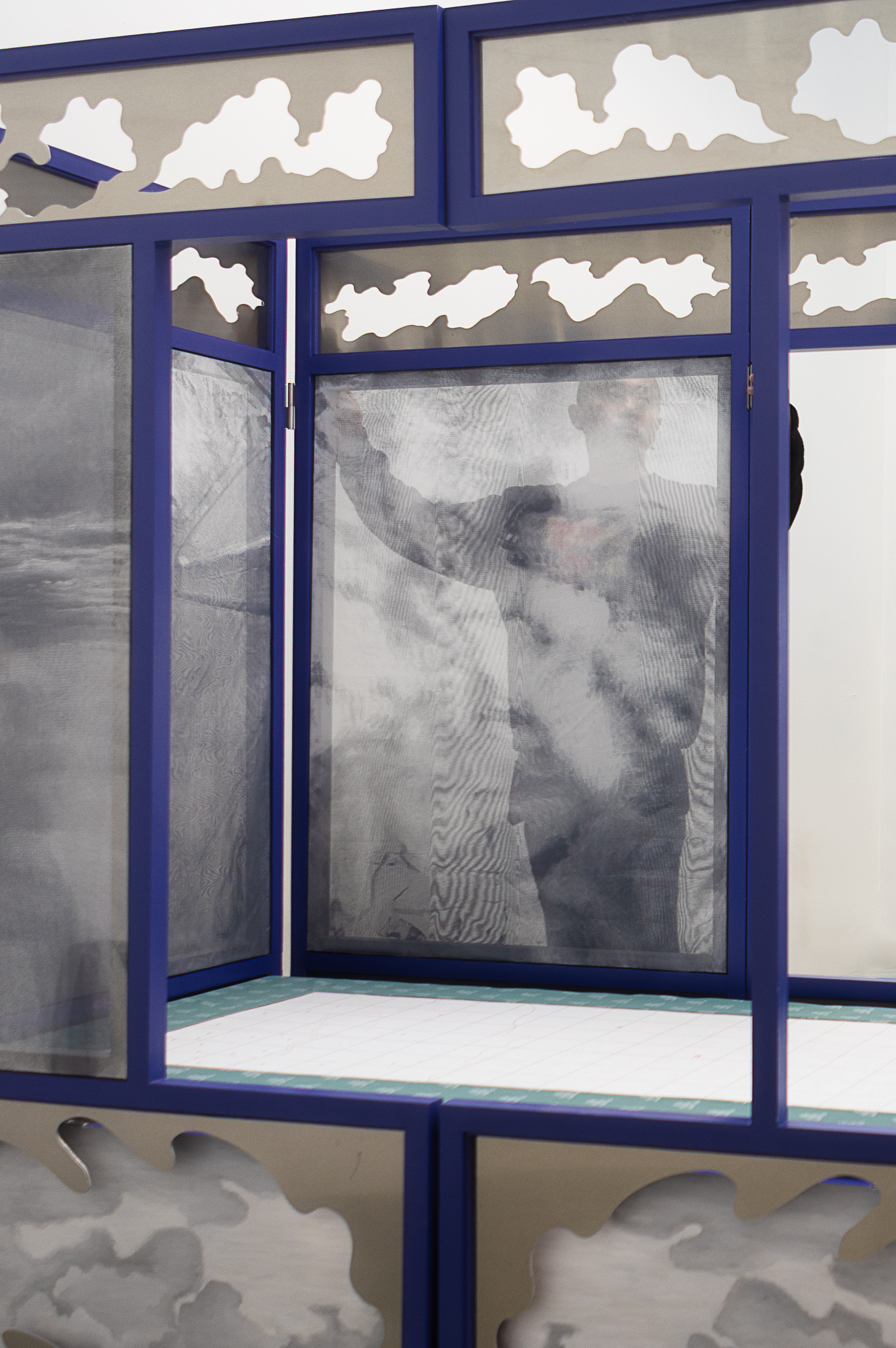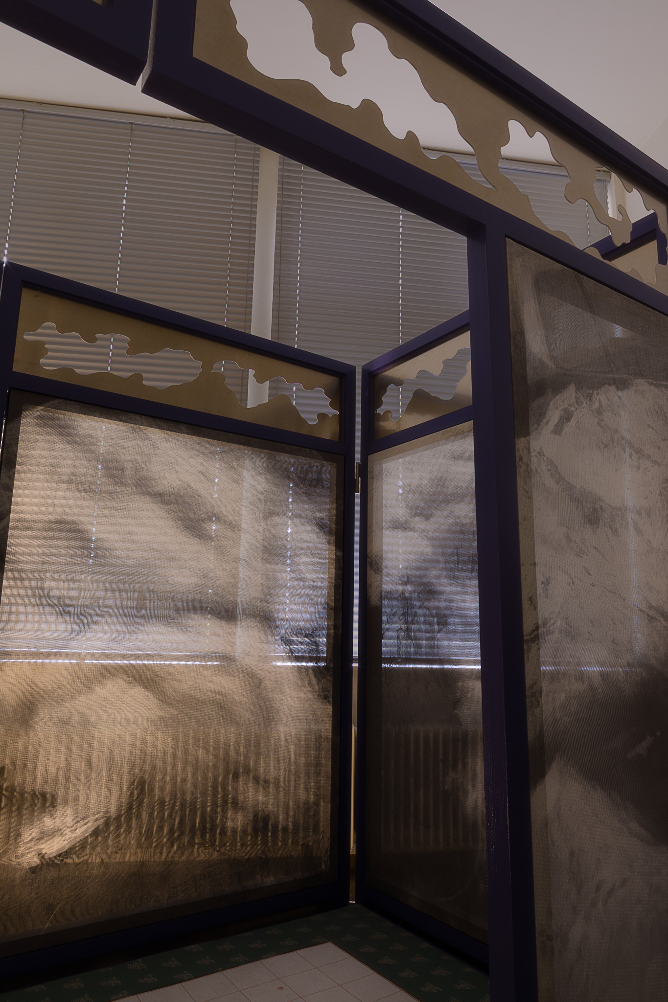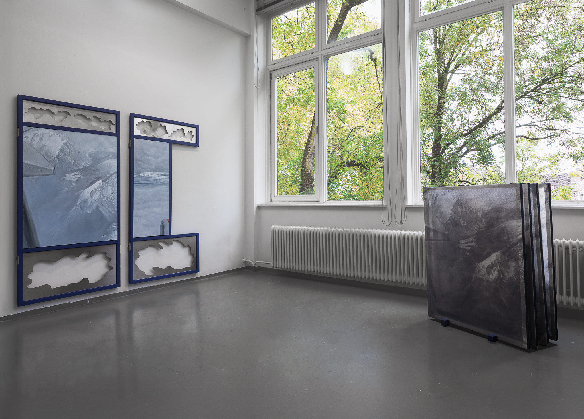 Clouds gathered from past journeys drift across the surfaces—fragments of memory, still yet restless. Traveling While Lying Down (卧游) recalls bed-screens in Imperial China whose painted panels turned rest into imaginative travel. The work moves between two lineages of landscape painting: one a scenic, museological hang, with fragments stilled and flattened for viewing, the other a daily, quiet act of repair, a momentary folding of the landscape into a functioning bed. An invitation to dwelling and participation, depending on when one arrives, the other half is always elsewhere. You catch one state and imagine the other. The exhibition is part of Open Studios 2025 at Jan van Eyck Academie.